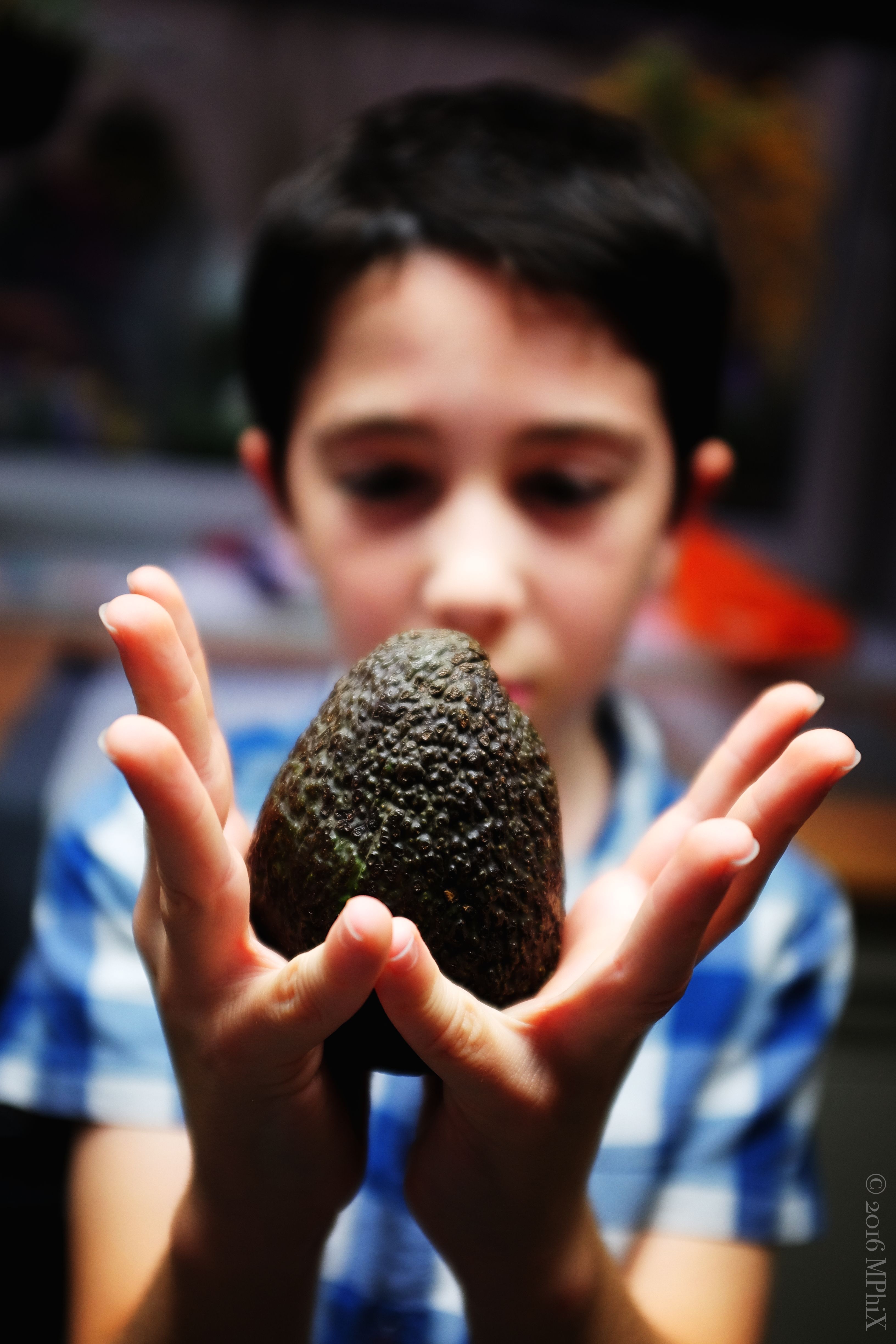 With anticipation the imagination hatches some wonderful things, like an embryonic dragon curled up inside the wrinkled dark shell of an exotic egg-shaped avocado, and guarded over momentarily by an eager young boy anticipating his new parental role.