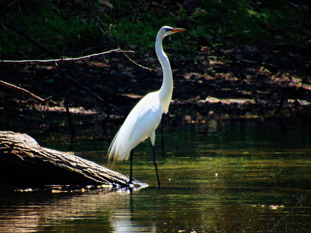 This is the best I’ve been able to do with this one. Not a terribly sharp image, but then this fellow was rather more evasive than its friend, the Blue Heron from the previous post. I was having to be quick on the trigger and at full zoom too. Also the light was very strong so there was a lot of glare off of the bird’s pristine white plumage. Certainly a first for me seeing a Blue Heron and a Great Egret in the same patch, in fact it’s the first time I’ve seen the Great Egret. We saw other creatures too on our walk along the C&O Canal: a couple of Skinks (lizards), a Common Garter Snake, which I mistook for a tree root and almost trod on, and a plethora of turtles. Probably the most animals we’ve spotted on one of our walks yet. I keep hoping to capture a Golden Eagle on camera – we’ve come across a few now at close quarters, but each time I was without a camera! Typical…